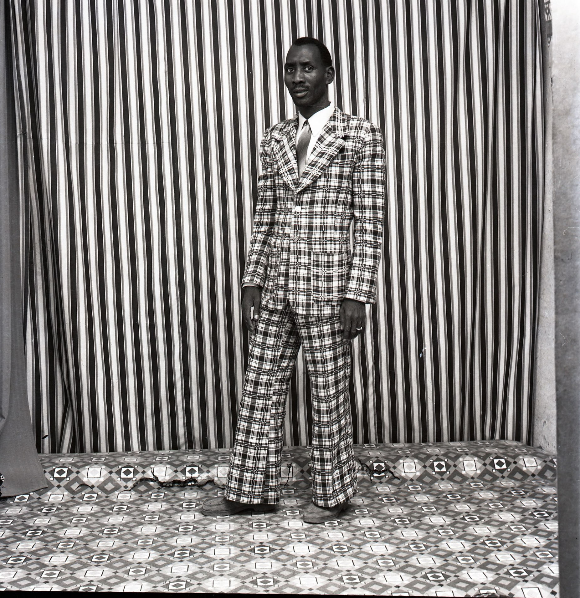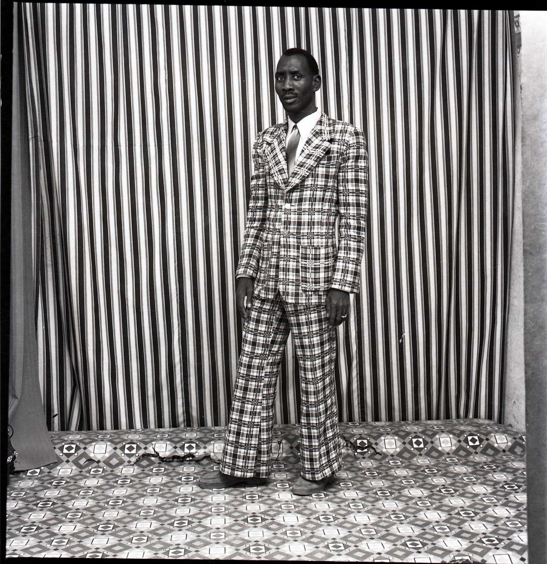 Malick Sidibé opened his studio in Bamako two years after Mali gained independence from French rule in 1960. There, he quickly became renowned for his carefully arranged portraits and nightlife photographs. Like Punjabi, he was a fixture in the community he photographed and paid special attention to the way Bamako’s youth responded to an increasingly authoritarian regime at home and Western cultural influences from abroad. In these two images, using the characteristic sense of performance that informed both photographers’ work, two men, on opposite sides of the world and a decade apart, prop up their right leg, put a hand on their hip and strike a pose.