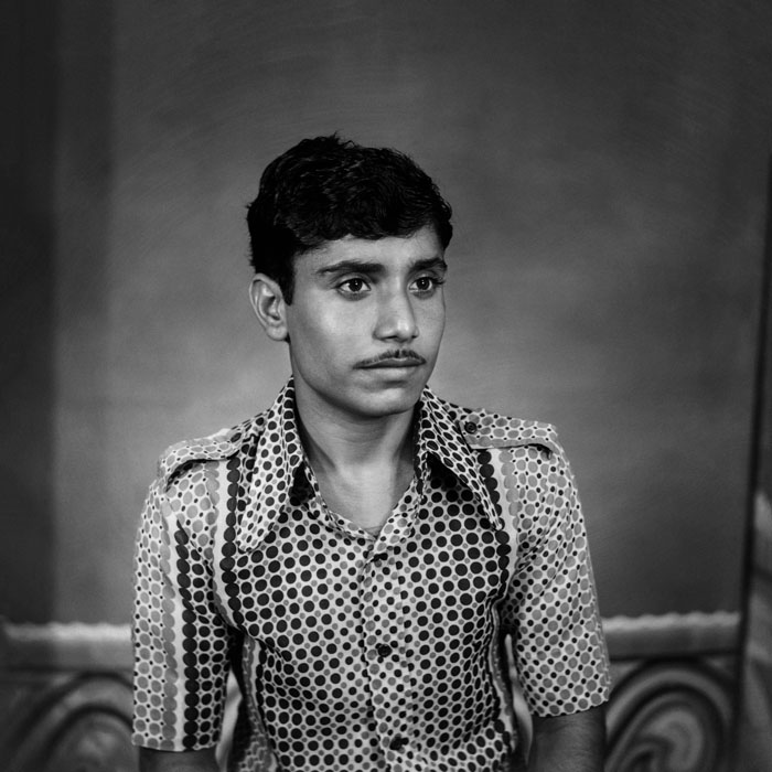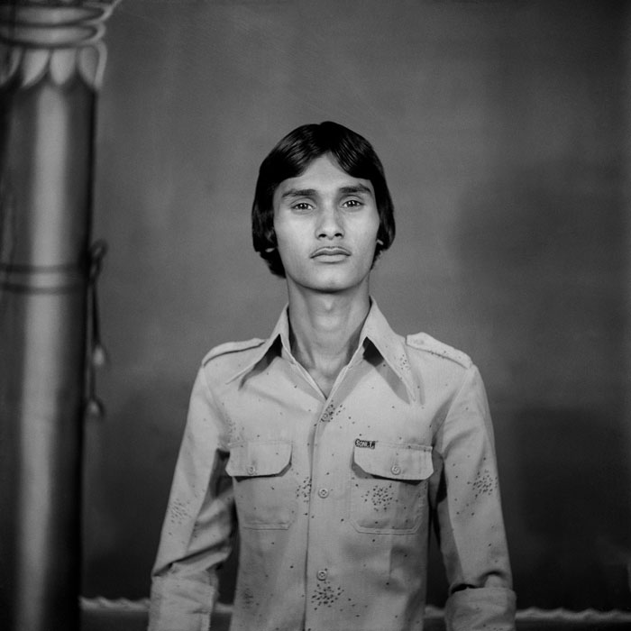 Punjabi recalls this young man asking for a portrait that would make him look like a “smart, gentleman photographer.” The magazine, camera and tie featured in this image are all props, demonstrating Punjabi’s effort to meet his client’s expectations.
