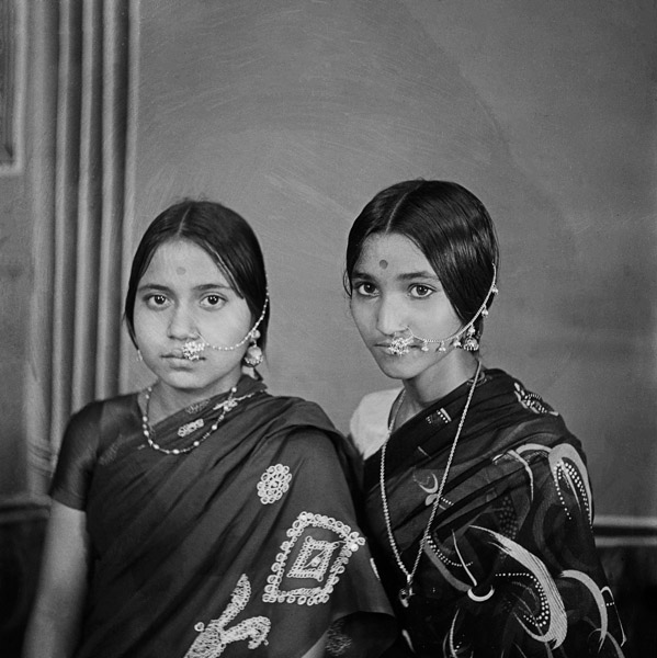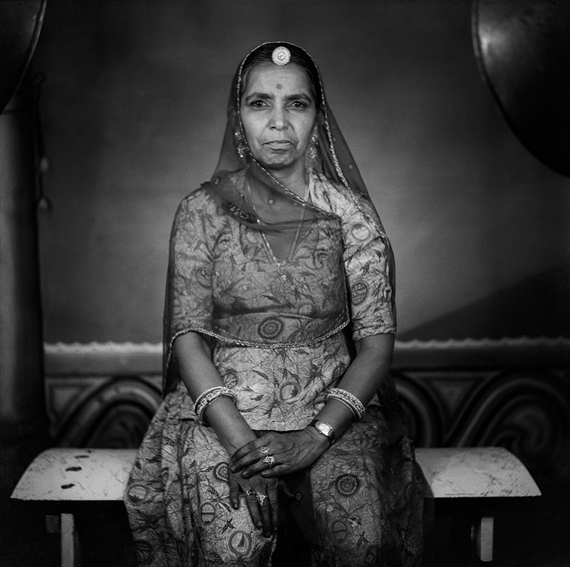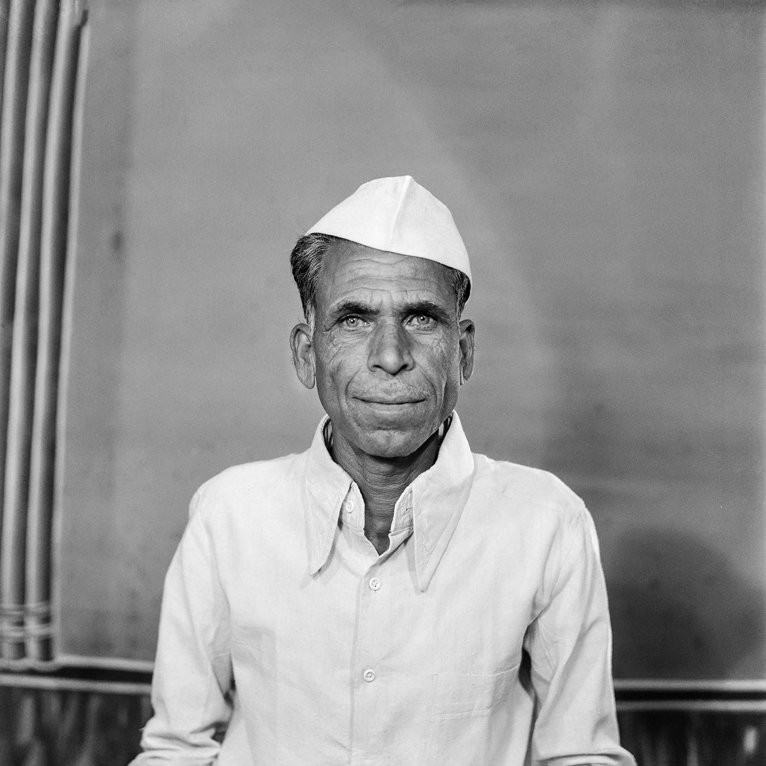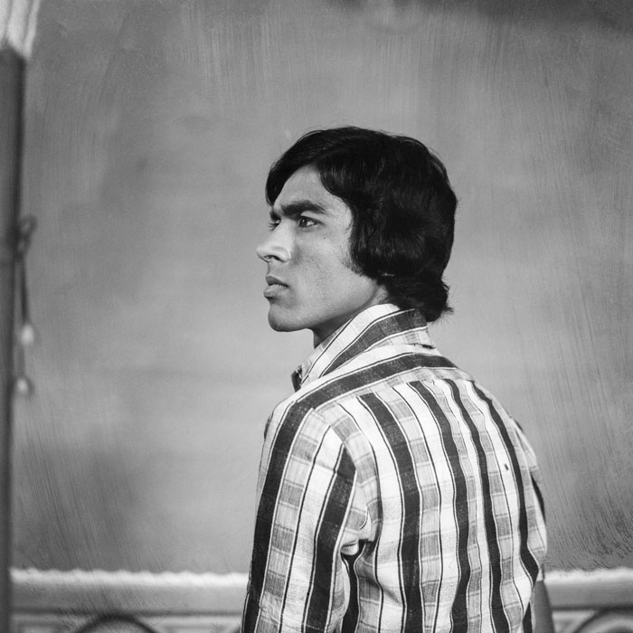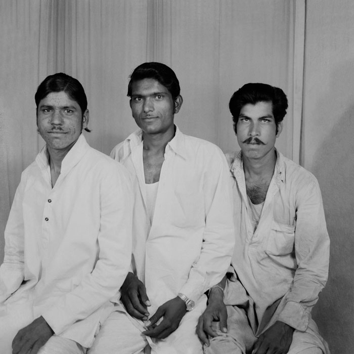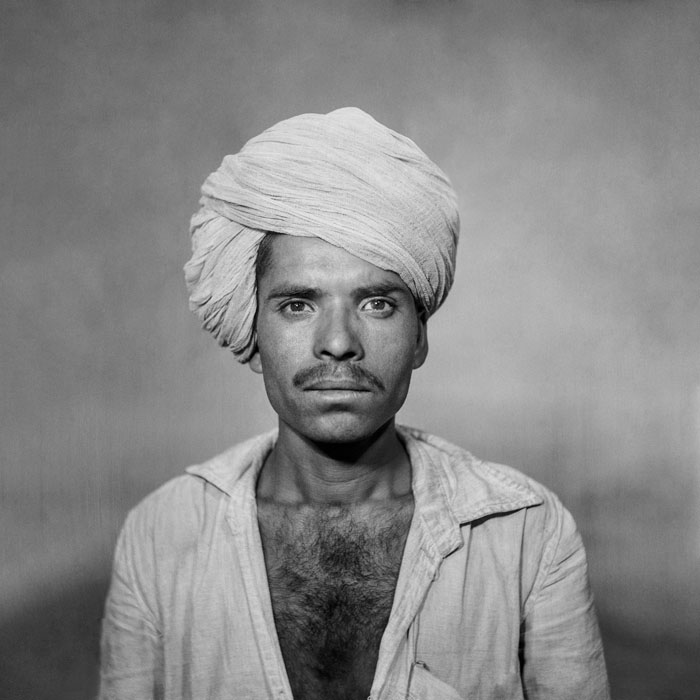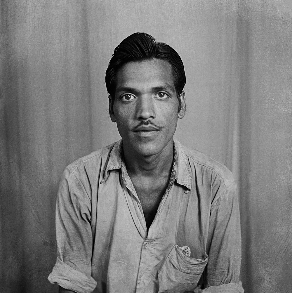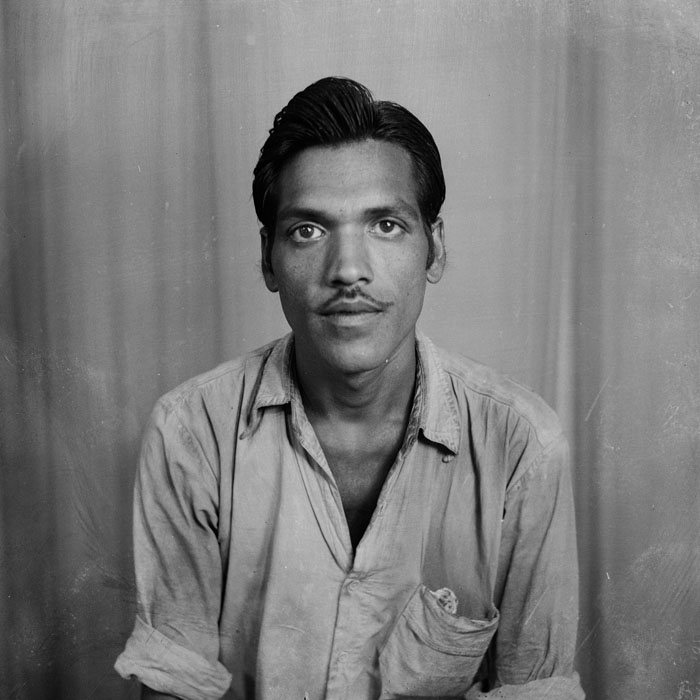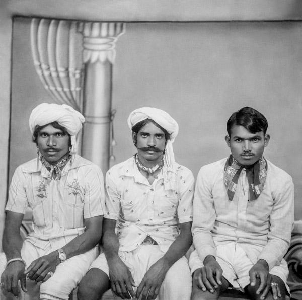 A farmer from near Nagda visits Punjabi’s studio to have his portrait made for the first time. While the purpose of the photo is unclear, the man’s wide-eyed stare suggests that the camera either caught him by surprise or that he was overly exerting himself in an attempt to pose appropriately. His all-white attire, turban and Punjabi’s use of a shallow depth of field add to the portrait’s intrigue.