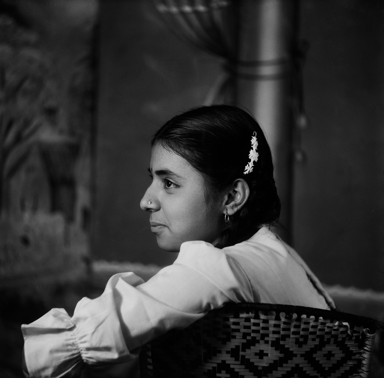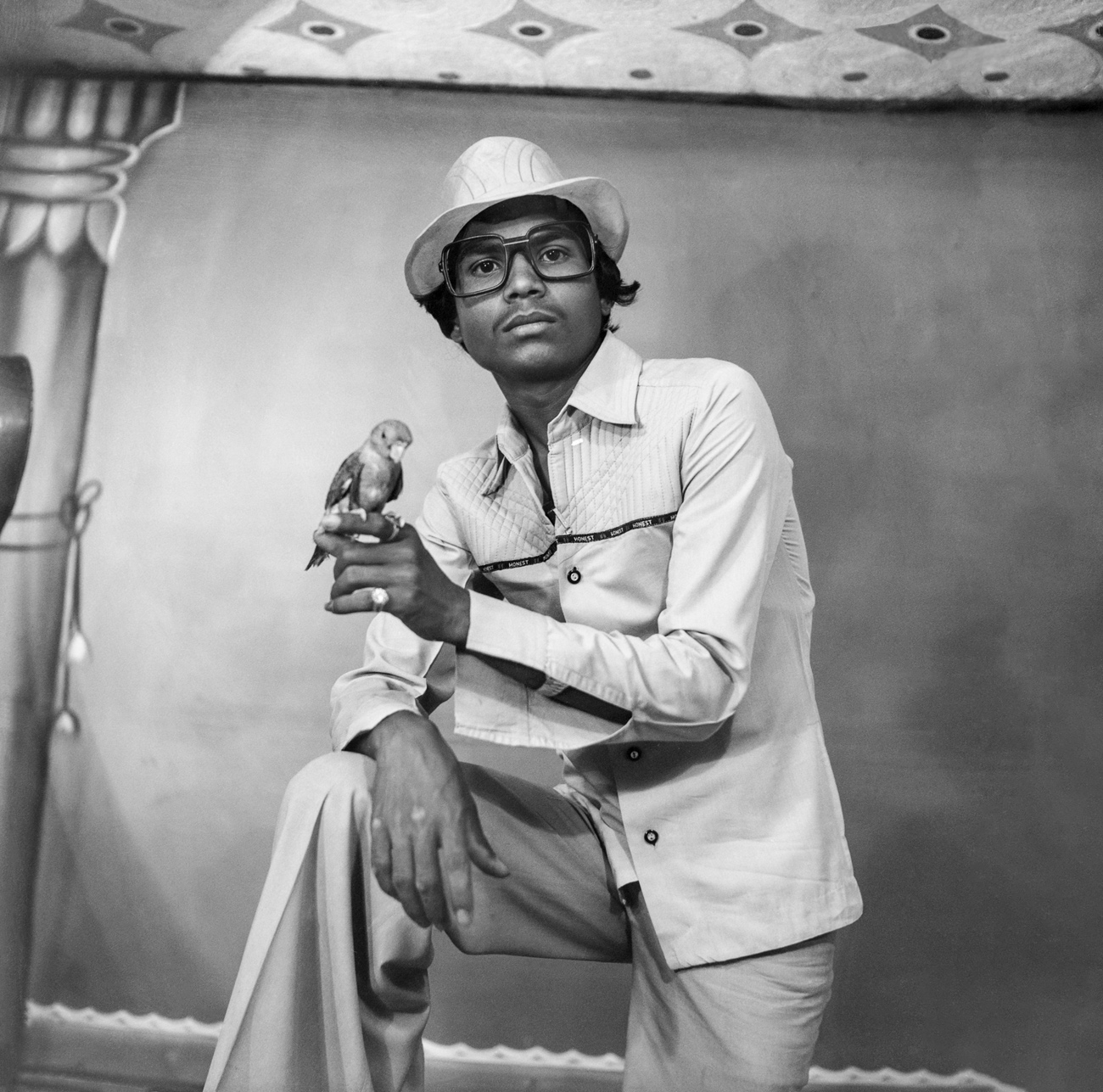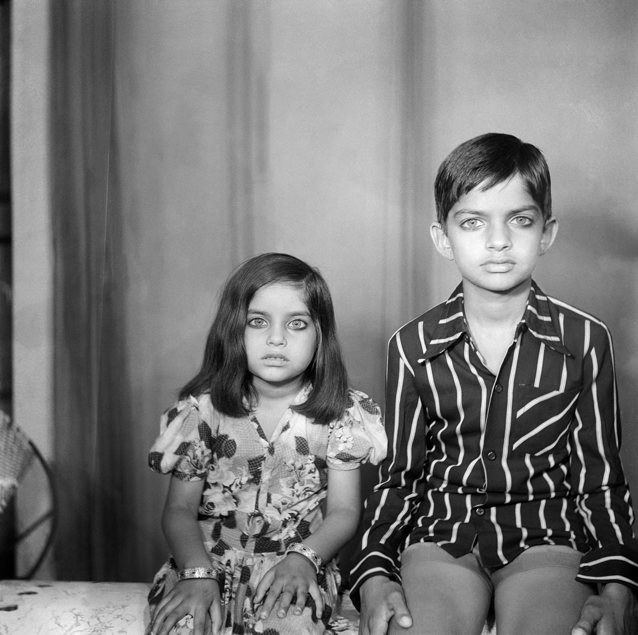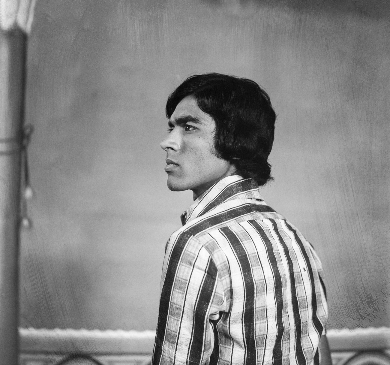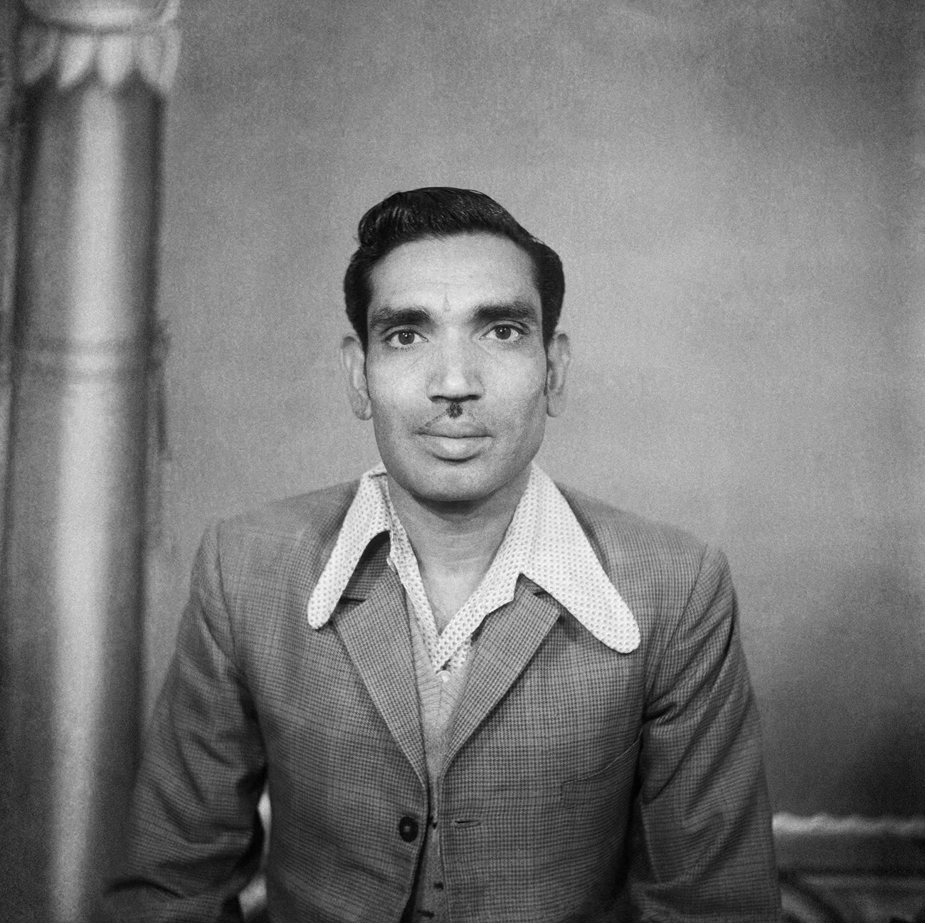A farmer from near Nagda visits Punjabi’s studio to have his portrait made for the first time. While the purpose of the photo is unclear, the man’s wide-eyed stare suggests that the camera either caught him by surprise or that he was overly exerting himself in an attempt to pose appropriately. His all-white attire, turban and Punjabi’s use of a shallow depth of field add to the portrait’s intrigue.