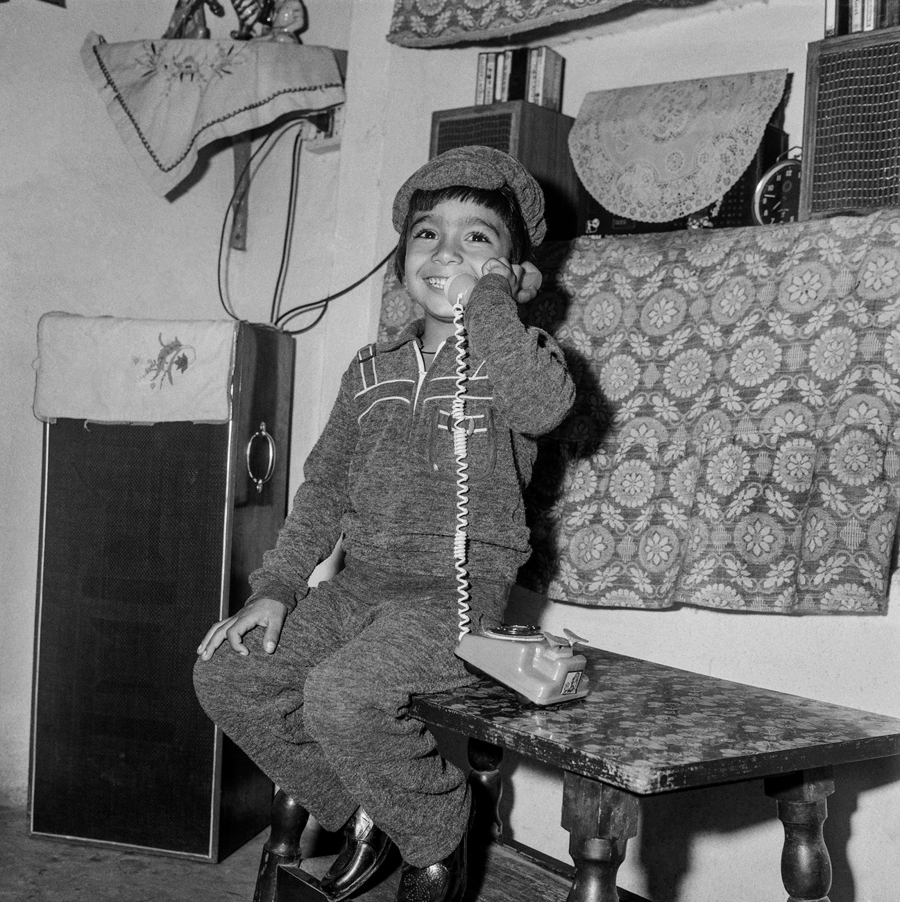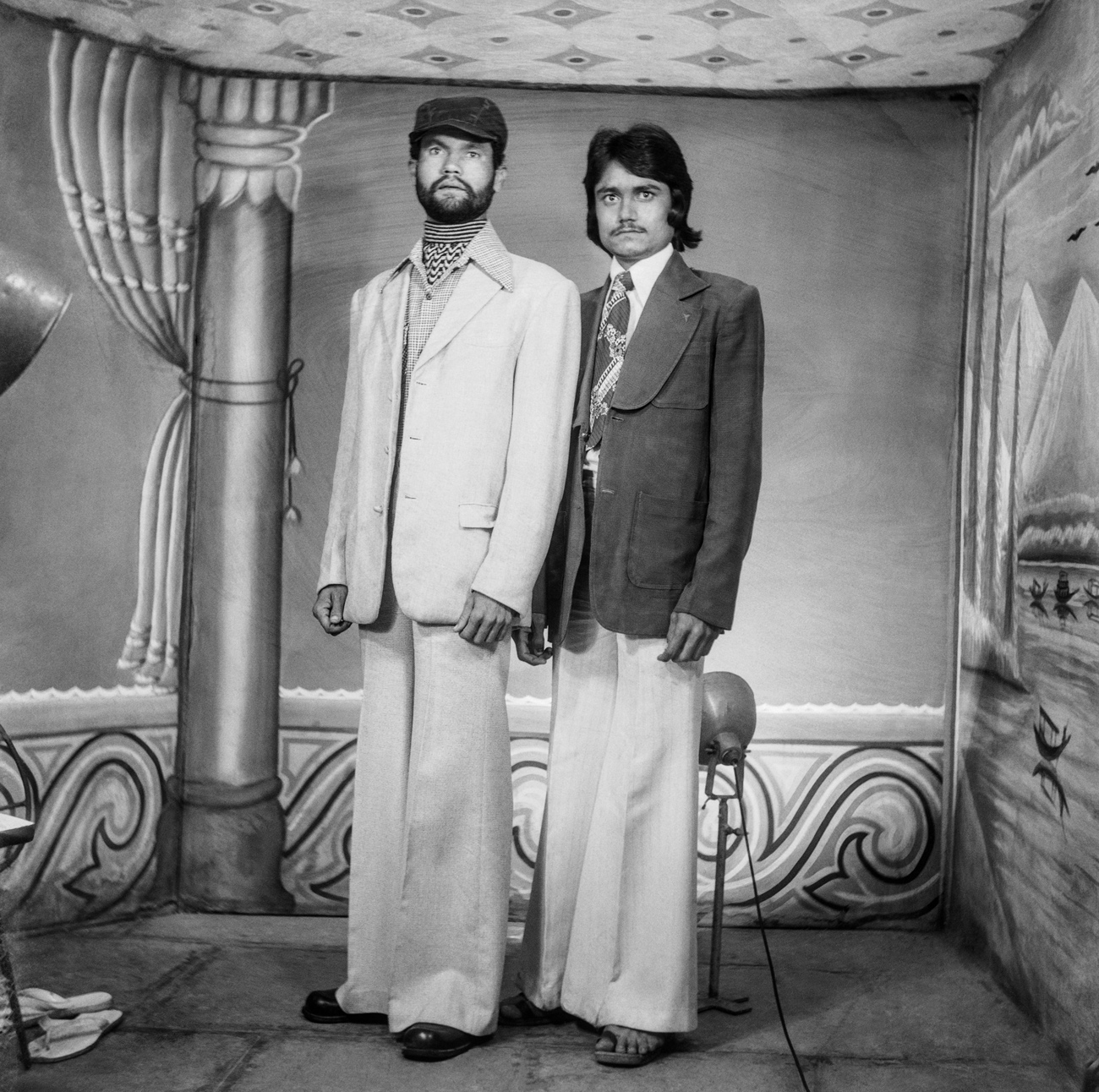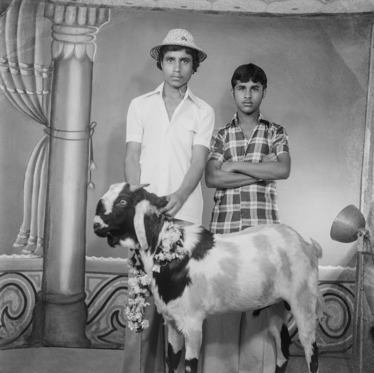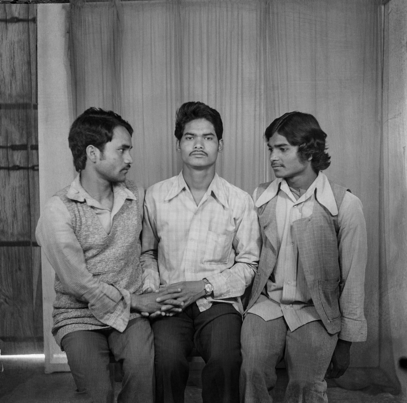 Running Studio Shehrazade in his home city of Sidon, Hashem El Madani dedicated much of his fifty-year career — starting in 1948 — to photographing nearly all its residents, including through the Lebanese Civil War. During this time, it wasn’t uncommon for him to encourage his sitters to use props he had bought for his studio, a practice that he shared with Punjabi, whose images were often also furnished with prop ties, sunglasses, cameras, bottles and magazines. In this pair of images, Madani’s sitter, a young boy named Muwafaq el Rawas, pretends to turn the knobs on a radio, while Punjabi’s sitters, two unnamed men, pose holding a smaller transistor radio — the first in Nagda — up to their ears. In responding to the fervor for new technologies in Sidon and Nagda, both photographers were able to bring various objects, and the cultural capital they exhibited at the time, into their photographic arrangements.