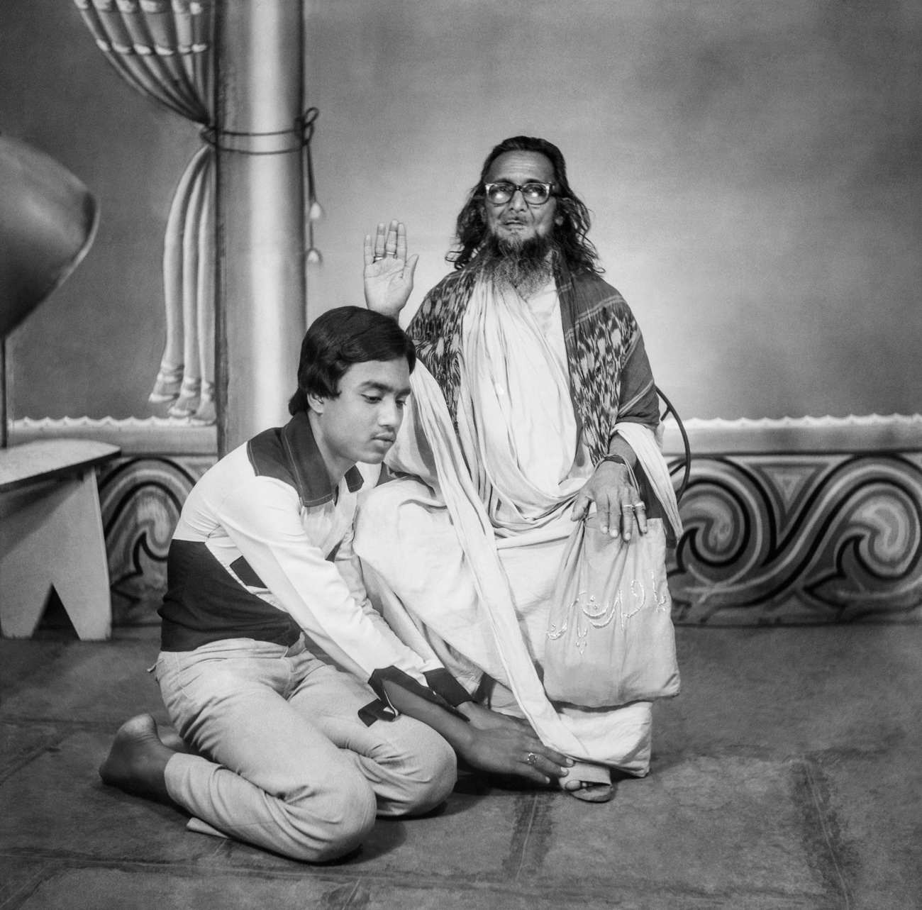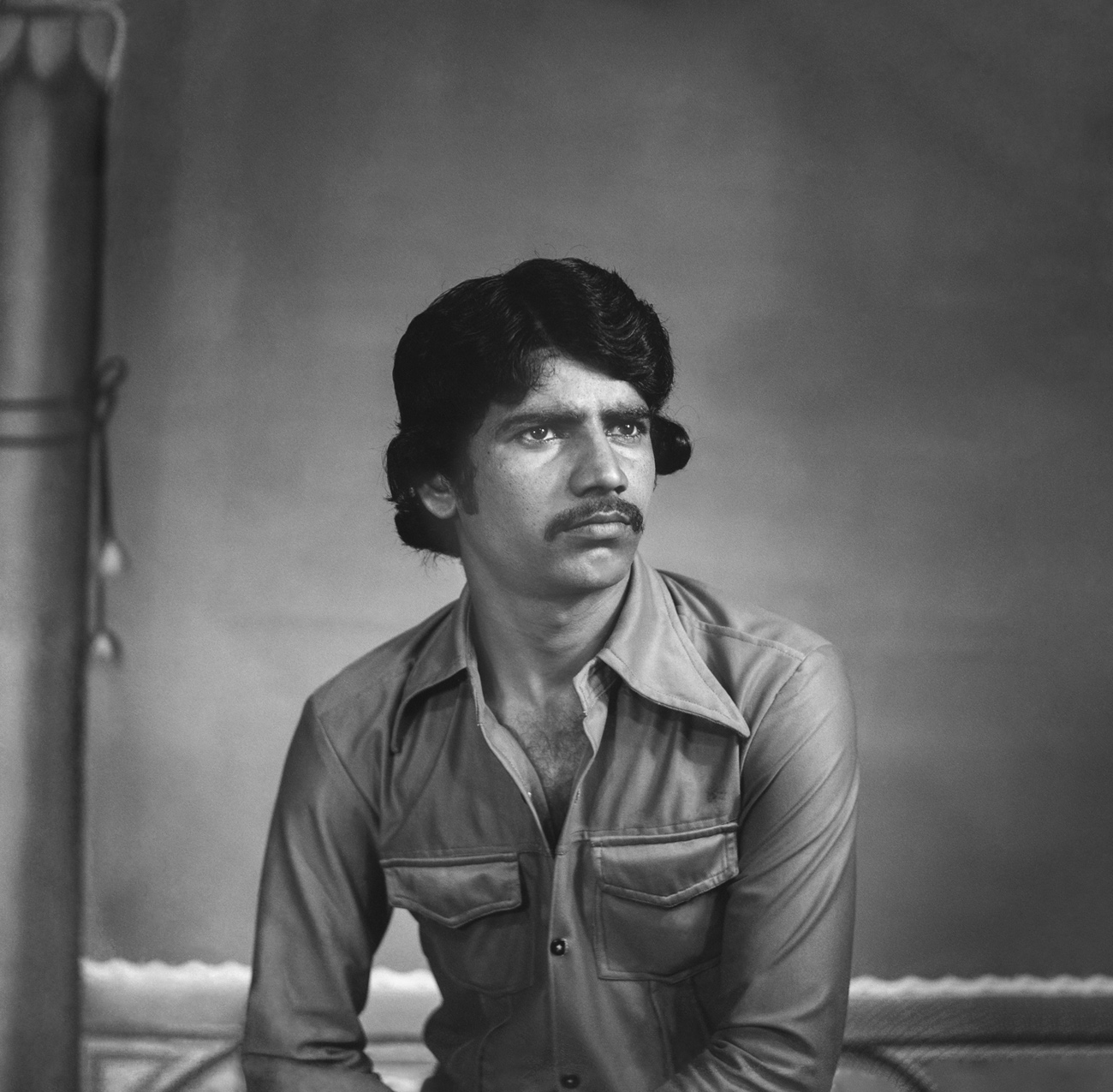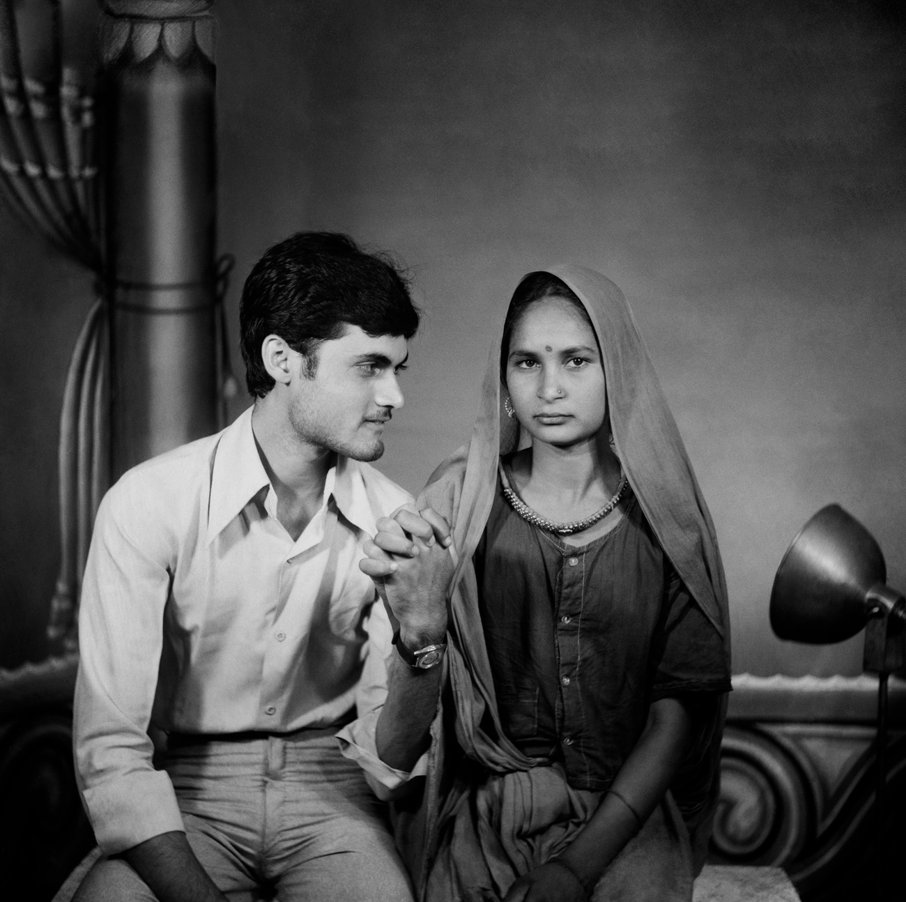 Singh and his son are train porters, photographed wearing the copper armbands synonymous with the profession. At the time, the armband stood as an especially charged symbol of working class pride — crystallised by the release of Coolie (1983), where Amitabh Bachchan plays a porter from Mumbai. Objects such as the copper armband allowed people to bring a range of cultural referents and sociopolitical attitudes into the photographic space.