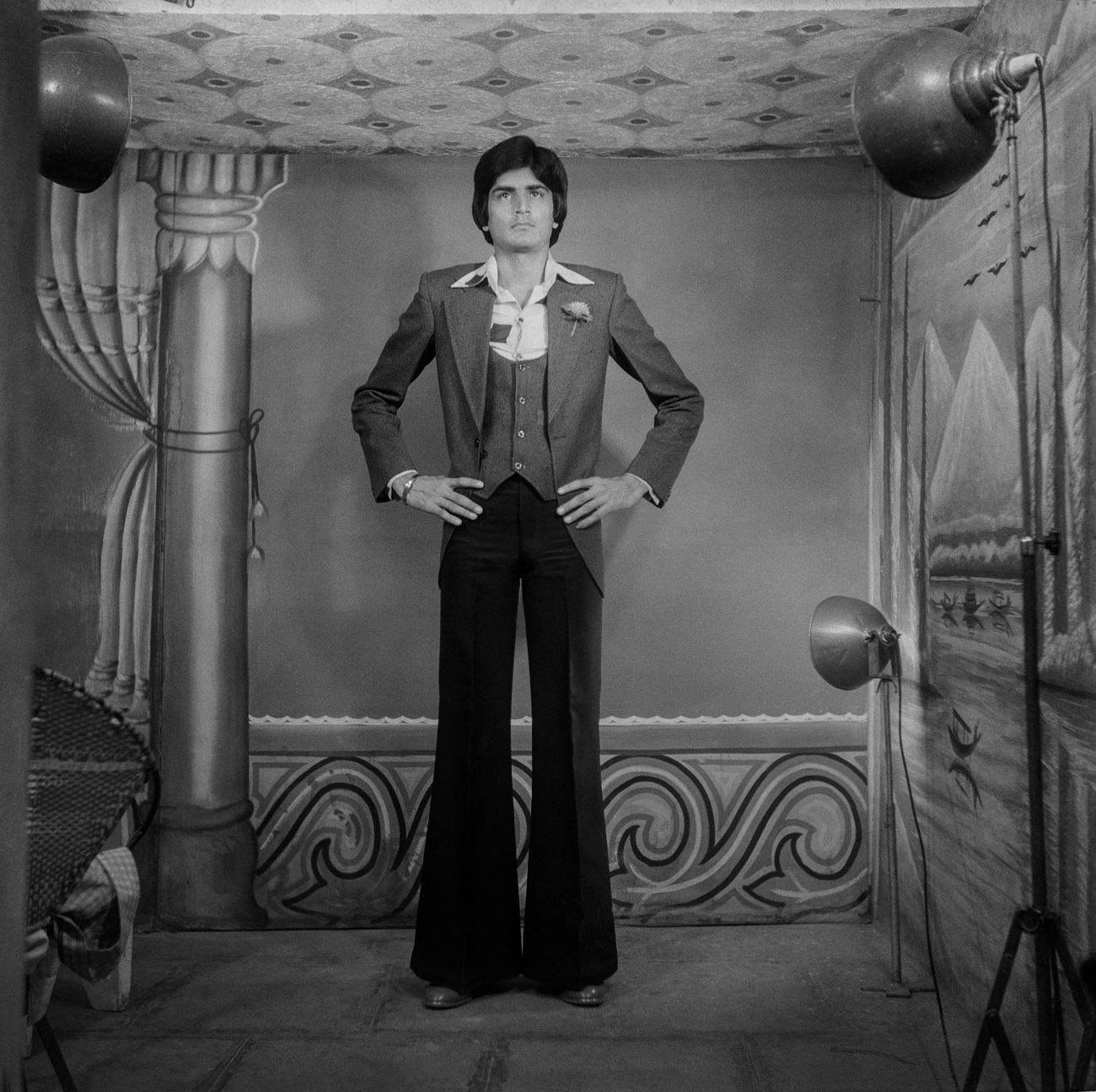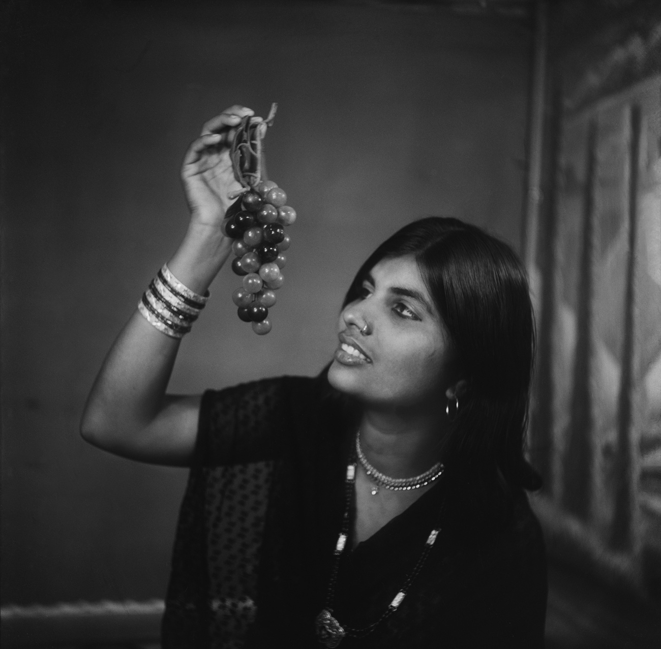 It wouldn’t be far-fetched to assume that the man standing in a three-piece suit with flared trousers and his hands on his hips knows he resembles a young Amitabh Bachchan; or that the woman holding a cluster of grapes to her face is deliberately imitating a popular filmic trope. Though distinct in their setup, what unites these portraits is the dialogue that produced them.