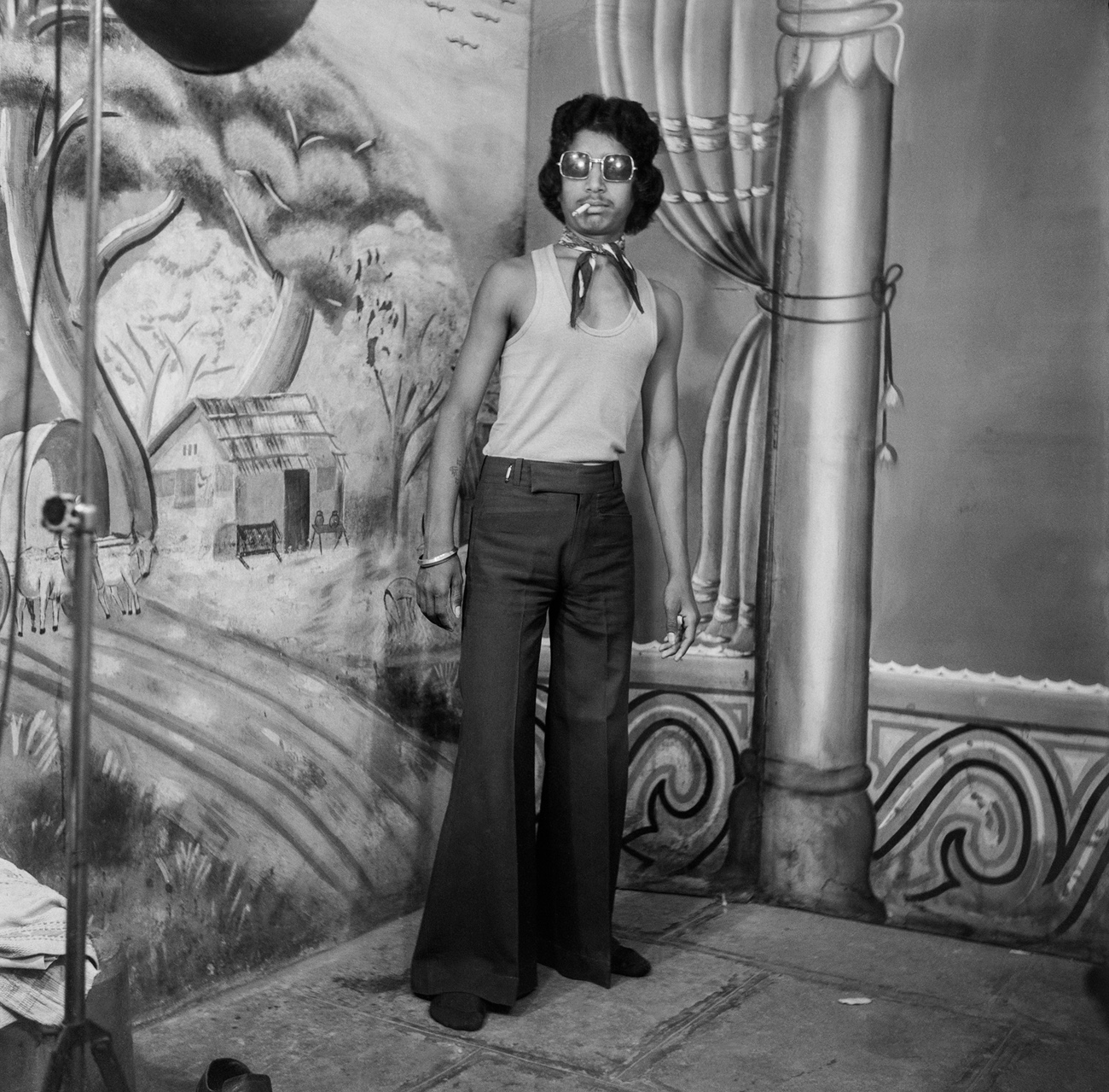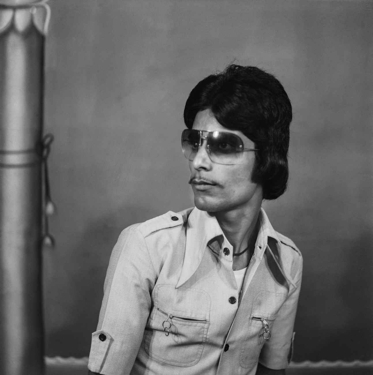 The Japanese Yashica — presumably Punjabi’s — slung on this man’s shoulder was a pricey piece of equipment that didn’t typically circulate beyond urban markets. Its existence in this portrait speaks to the sitter’s desire for 'smartness,' expressing a degree of professional acuity as well as socioeconomic mobility and access.