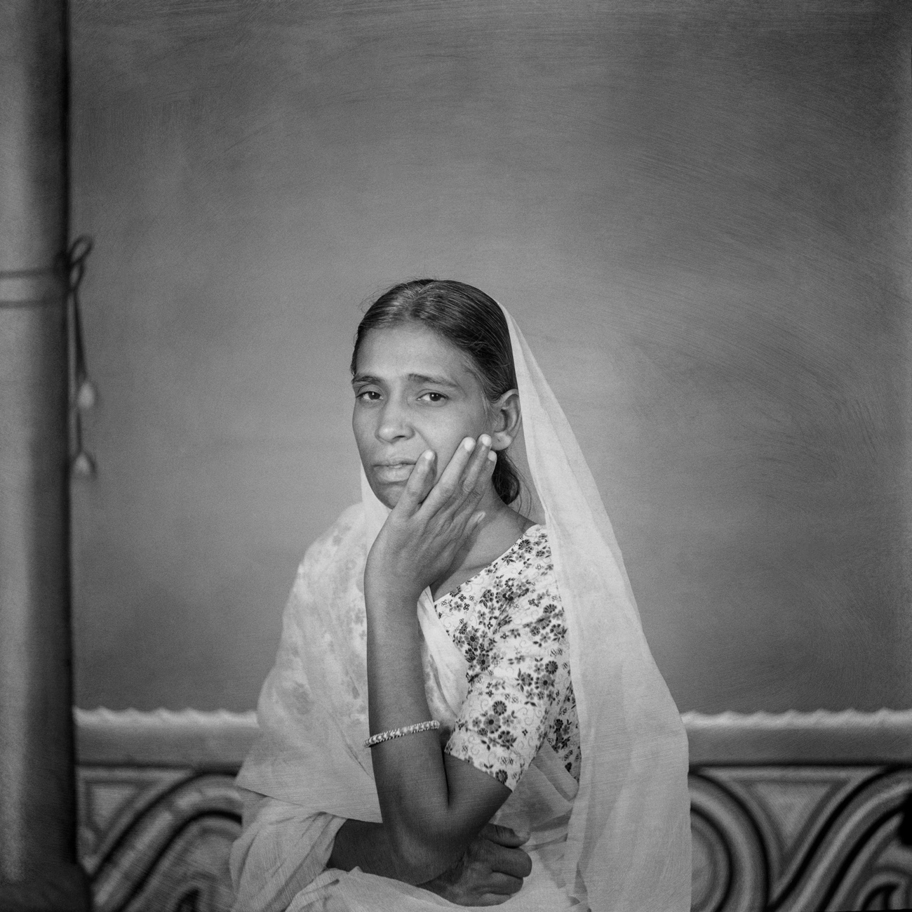 In this portrait, like so many others from Punjabi’s archive, Suhag Studio’s painted background reappears, featuring a lone pillar accompanied by thick drapes and a curling base design. In an otherwise confined photographic space, this painting enlarges the portrait’s sense of grandeur.